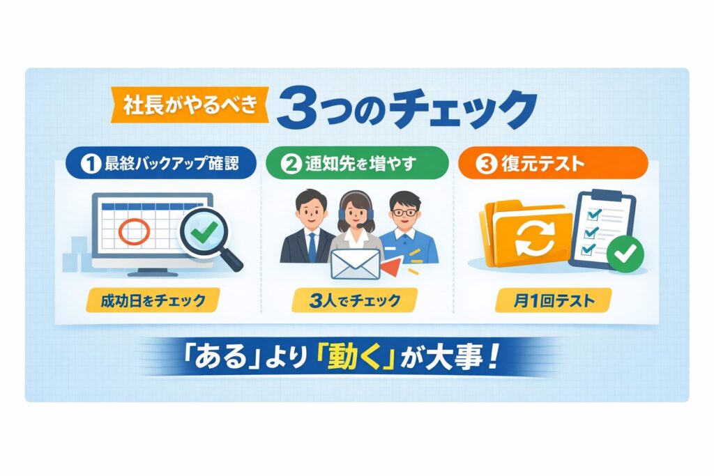 バックアップは「あること」より「動いていること」がすべてです。確認しない安心は、ただの願望です。