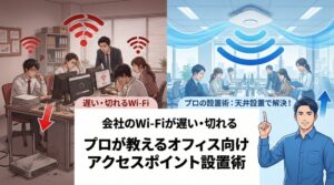 会社のWi-Fiが遅い・切れる原因は「位置」にあり?プロが教えるオフィス向けアクセスポイント設置術 「あ、また切れた……」 大事な商談の最中、Zoomの画面がカクついて冷や汗をかいたことはありませんか?あるいは、社員から「社長、会議室のWi-Fiが全然繋がらないんです...