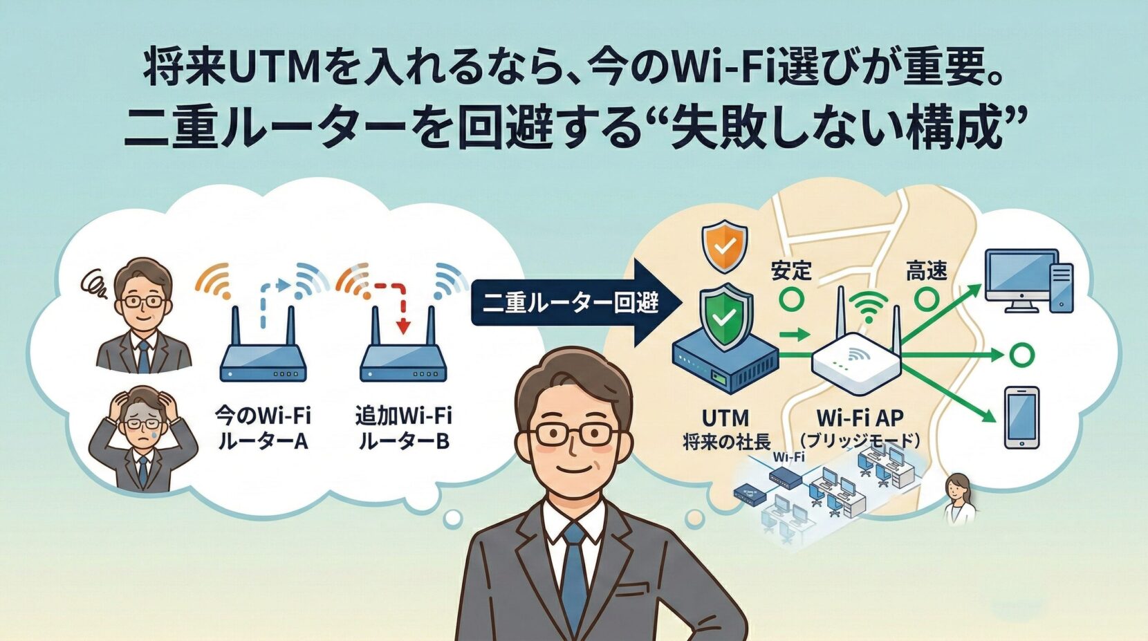 この記事では、将来UTMを入れる前提で“失敗しないWi-Fi構成”を、社長が判断できるレベルまで具体化します。