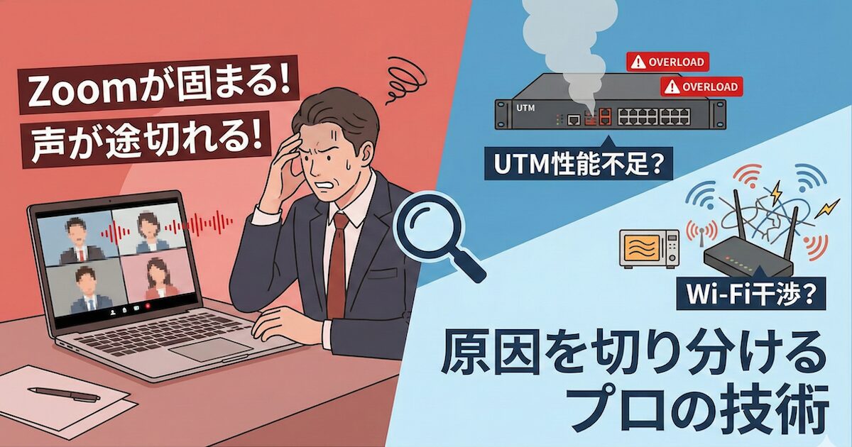 Zoomが固まる原因は、回線が細いからではなく、オフィスのどこかで「詰まり」が発生しているからです。犯人がUTMなのかWi-Fiなのか、あるいは設定なのか。それさえ分かれば、高いコンサル料を払わなくても解決の糸口は見えてきます。